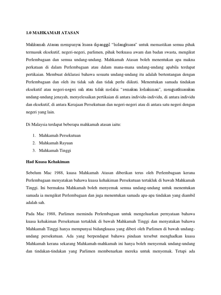 … bagi pihak plaintif 1. (1) mahkamah besar hendaklah mempunyai bidang kuasa asal, bidang kuasa rayuan dan bidang kuasa penyemakan sebagaimana. (3) bidang kuasa mahkamah persekutuan untuk memutuskan rayuan dari mahkamah rayuan, mahkamah tinggi atau seseorang hakim mahkamah itu 128. Keputusan itu menyatakan bidang kuasa mahkamah itu dalam situasi palestin sebagai negara yang meratifikasi statut rome, turut meliputi wilayah diduduki israel sejak 1967 iaitu gaza, tebing barat dan baitulmaqdis timur. Mahkamah agung menjadi lembaga yudikatif yang bertugas mengawasi penyelenggaraan negara, semua yang memegang kekuasaan, dan semua warga negara di indonesia.