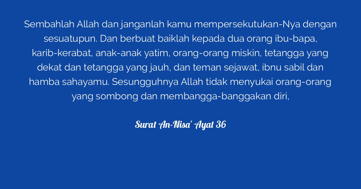26 july 2018 / media club indonesia. Read surah an nisa with english translation and transliteration. Do good to your parents, to near of kin, to orphans, and to the needy, and to the neighbour who is of kin and to the neighbour who is a stranger, and to the companion by your side,62 and to the wayfarer, and to those whom your right hands possess. Read or listen al quran e pak online with tarjuma (translation) and tafseer. Waoaabudoo allaha wala tushrikoo bihi shayan wabialwalidayni ihsanan wabithee alqurba waalyatama waalmasakeeni waaljari thee alqurba waaljari aljunubi waalssahibi bialjanbi waibni alssabeeli wama malakat aymanukum inna allaha la yuhibbu man kana mukhtalan. Compare all quran translations v2.0. Surah an nisa 36 qori ustadz abdul gofur ngaji yuk. Ascribe no thing as partner unto him. Listen surah nisa audio mp3 al quran on islamicfinder. Copy advanced copy tafsirs share quranreflect bookmark. We will elaborate on this subject in the tafsir of surah bara'h, allah willing and upon him we depend. Arabic bangla/bengali deutsch english indonesian russian türkçe urdu. Bismillah hir rahman nir raheem in the name of allah, the most gracious and the most merciful.